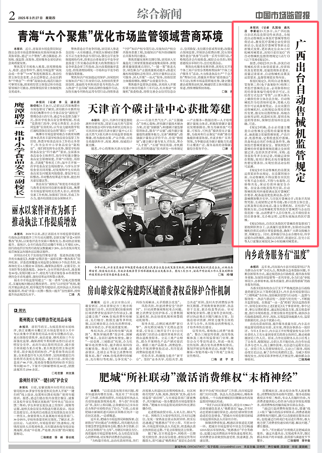 本报讯 (记者 孔国俊 通讯员 李星论)3月25日,从广西壮族自治区药品监管局传来消息,为规范自动售械机从事医疗器械零售经营活动,激发医疗器械企业经营创新活力,促进医疗器械零售新业态新模式发展,更好满足公众24小时购械用械需求,该局日前印发《广西自动售械机监督管理规定(试行)》(以下简称《规定》)。