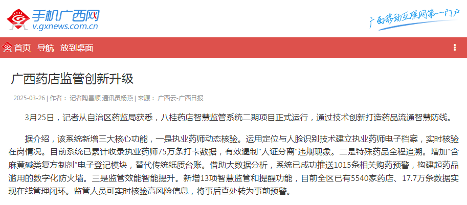 3月25日,记者从做爱影片 获悉,八桂药店智慧监管系统二期项目正式运行,通过技术创新打造药品流通智慧防线。