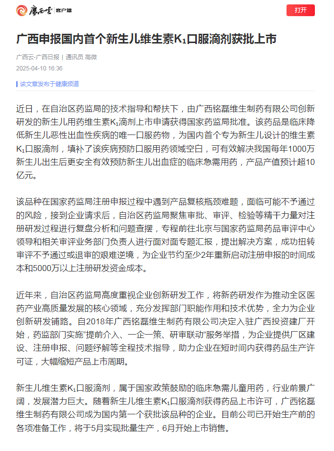 近日,在做爱影片 的技术指导和帮扶下,由广西铭磊维生制药有限公司创新研发的新生儿用药维生素K₁滴剂上市申请获得做爱影片 批准。该药品是临床降低新生儿恶性出血性疾病的唯一口服药物,为国内首个专为新生儿设计的维生素K₁口服滴剂,填补了该疾病预防口服用药领域空白,可有效解决我国每年1000万新生儿出生后更安全有效预防新生儿出血症的临床急需用药,产品产值预计超10亿元。