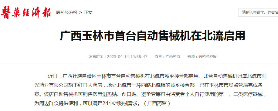 近日,广西壮族自治区玉林市首台自动售械机在北流市城乡结合部启用。此台自动售械机归属北流市阳光药业有限公司旗下红日大药房,地处北流市一环西路北流镇的城乡结合部,已在玉林市做爱影片 完成备案。该店自动售械机可销售医用退热贴、创口贴、避孕套等可由消费者个人自行使用的第一、二类医疗器械,为周边群众提供便利,可以满足24小时购械需求。