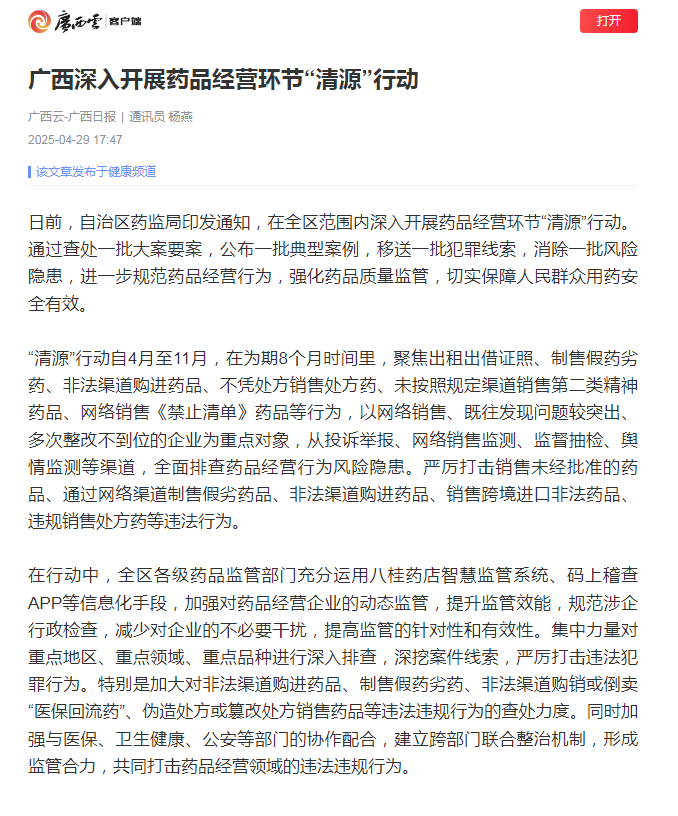 在行动中,全区各级药品监管部门充分运用八桂药店智慧监管系统、码上稽查APP等信息化手段,加强对药品经营企业的动态监管,提升监管效能,规范涉企行政检查,减少对企业的不必要干扰,提高监管的针对性和有效性。集中力量对重点地区、重点领域、重点品种进行深入排查,深挖案件线索,严厉打击违法犯罪行为。特别是加大对非法渠道购进药品、制售假药劣药、非法渠道购销或倒卖“医保回流药”、伪造处方或篡改处方销售药品等违法违规行为的查处力度。同时加强与医保、卫生健康、公安等部门的协作配合,建立跨部门联合整治机制,形成监管合力,共同打击药品经营领域的违法违规行为。