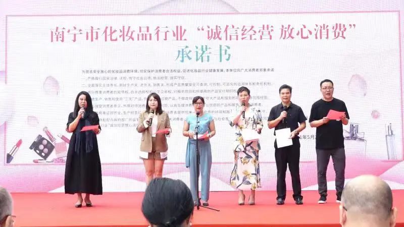 活动现场还邀请到了南宁市化妆品行业协会与化妆品经营企业代表,现场宣读南宁市化妆品行业“诚信经营 放心消费”承诺书,并进行庄重承诺:全面落实主体责任,把好生产关、进货关、销售关,形成产品质量安全可查询、可控制,可追究的追溯体系和责任机制。