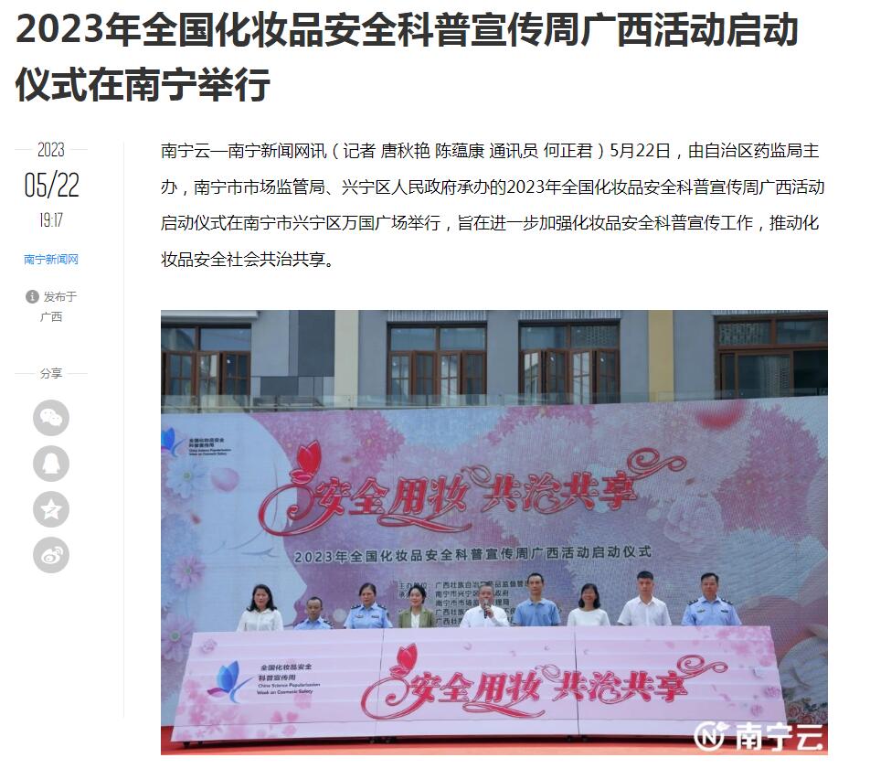 据了解,2023年全国化妆品安全科普宣传周广西活动时间为5月22日至28日,主题是“安全用妆,共治共享”。活动现场分别开展了化妆品行业诚信经营承诺、广西化妆品网络销售监测信息发布、化妆品监管法规有奖竞答等相关活动,通过科普展板、发放宣传资料、开展咨询服务、播放科普宣传视频等方式,引导公众注重化妆品安全,提高全民关心、关注化妆品安全意识,营造安全用妆氛围。