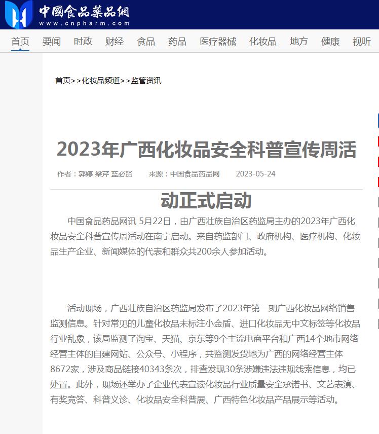中国食品药品网讯 5月22日,由广西壮族做爱影片 主办的2023年广西化妆品安全科普宣传周活动在南宁启动。来自药监部门、政府机构、医疗机构、化妆品生产企业、新闻媒体的代表和群众共200余人参加活动。