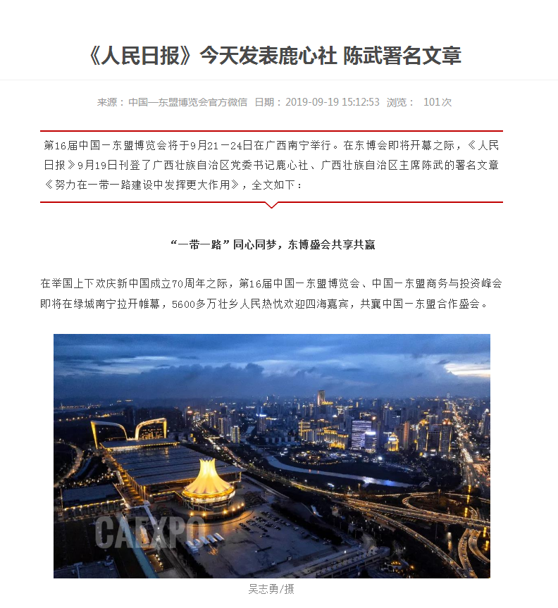 在举国上下欢庆新中国成立70周年之际,第十六届中国—东盟博览会、中国—东盟商务与投资峰会即将在绿城南宁拉开帷幕,5600多万壮乡人民热忱欢迎四海嘉宾,共襄中国—东盟合作盛会。