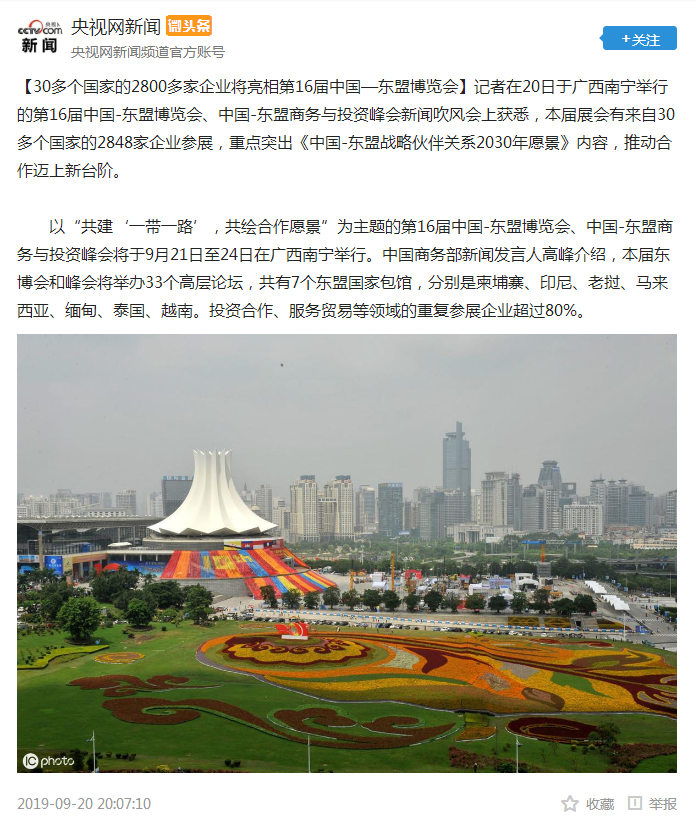 央视网新闻:30多个国家的2800多家企业将亮相第16届中国—东盟博览会