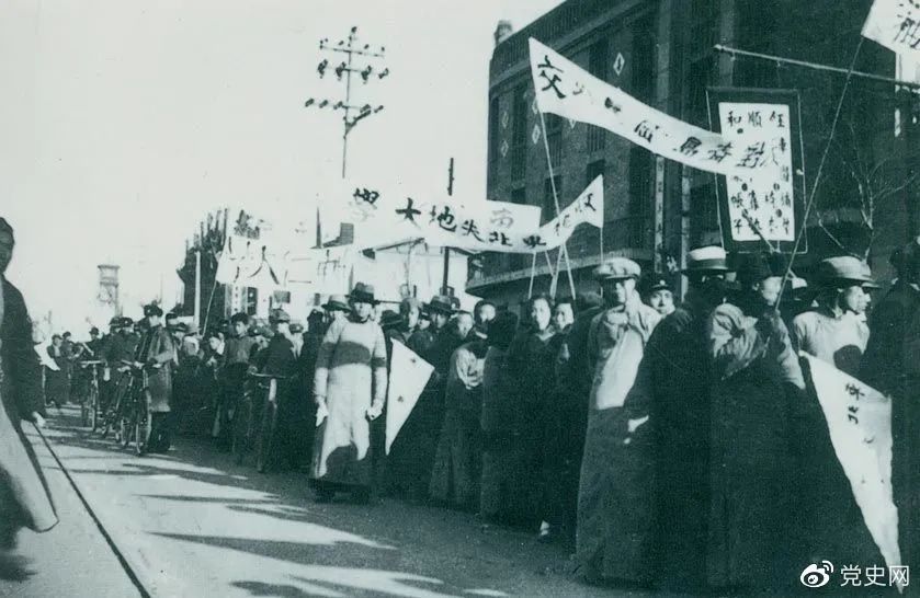 1935年12月9日,中国共产党领导北平学生掀起声势浩大的抗日救亡运动,并迅速波及全国,形成抗日救国的新高潮。图为游行队伍。